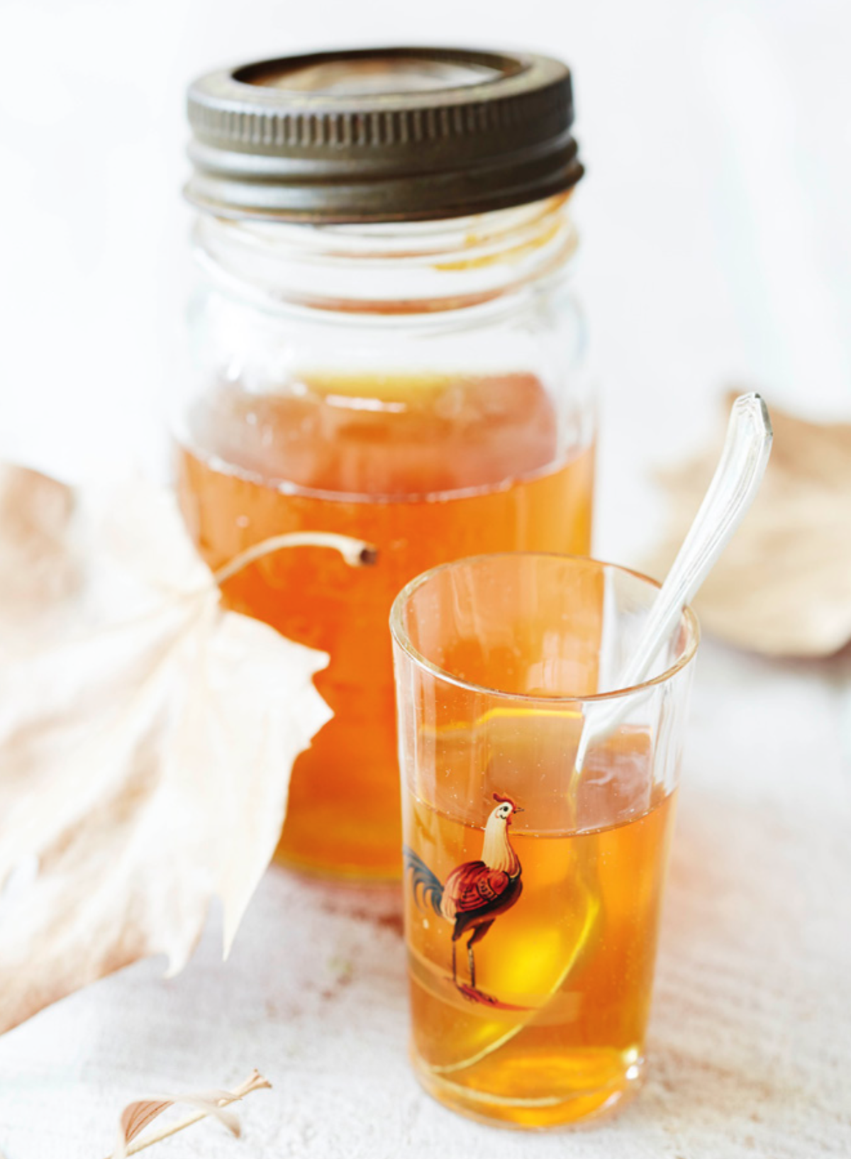 Once the kombucha is ready, carefully remove the SCOBY using a clean long-handled spoon and place it on a plate with a little of the liquid to stop it drying out (then use it to make another batch straight away). Pour out 100 ml (3 1/2 fl oz) of the kombucha and keep aside to make another batch, then pour the remaining liquid into a jug through a sieve and then into a clean glass bottle with a lid. Secure the lid tightly and make a note on the bottle of the date. The kombucha will keep in the fridge for 2–4 weeks.